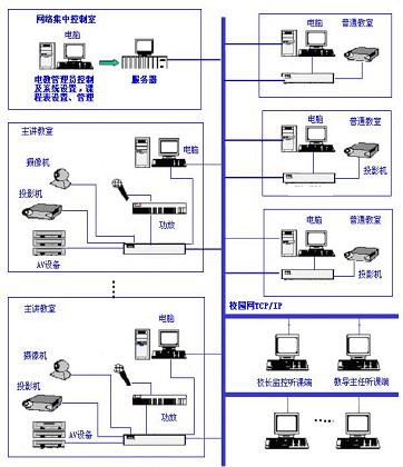 基於校园网(TCP/IP),利用电脑对所有的多媒体电教室进行管理。能够完成集中管理、集中控制、集中维护的功能。