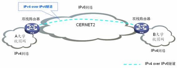A、B大学校园网的的出口路由器为双栈路由器。在A、B大学之间穿过CERNET2(IPv6网络)建立一条IPv4 over IPv6手工隧道,同时保证A、B间IPv4穿越隧道可达。